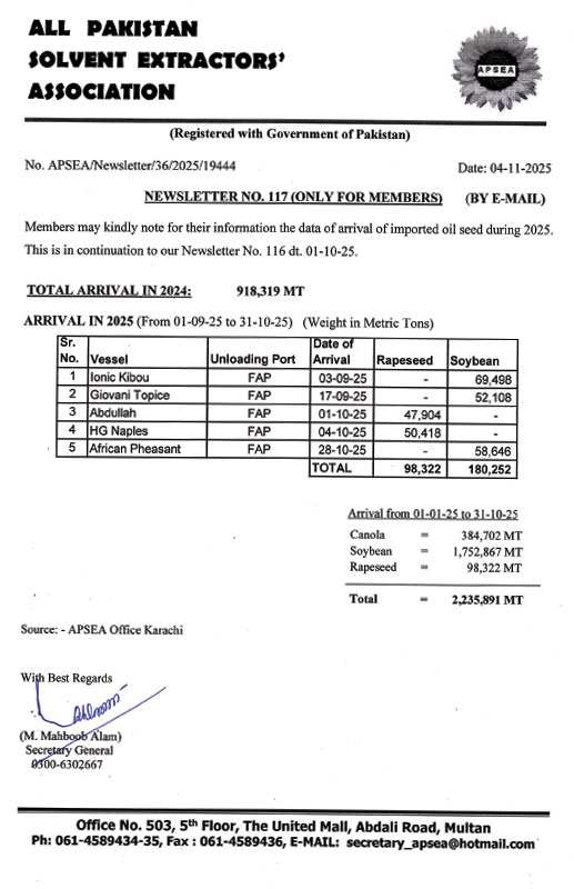 Members may kindly note for their information the data of arrival of imported oil seed during 2025. This is in continuation to our circular No. 116 dated