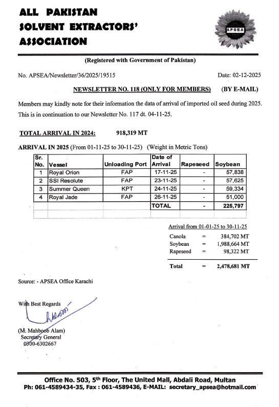 Members may kindly note for their information the data of arrival of imported oil seed during 2025. This is in continuation to our circular No. 117 dated