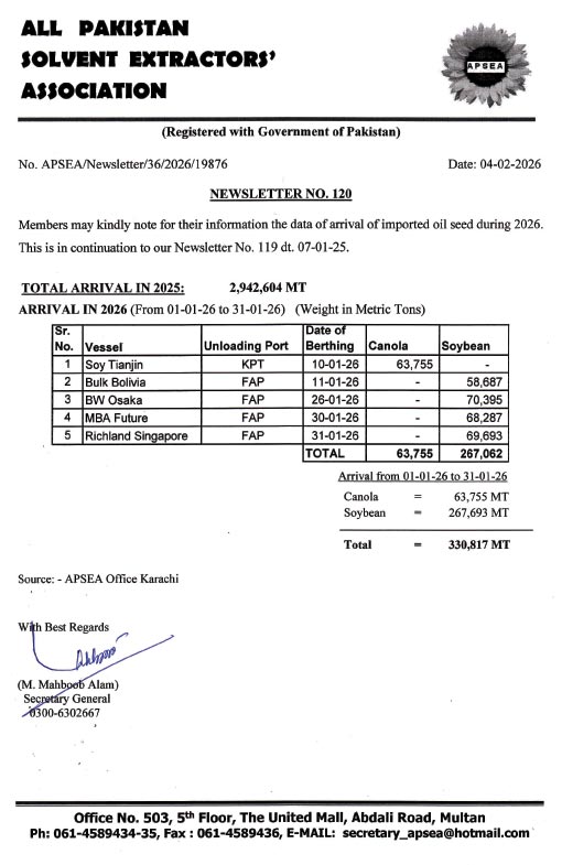 Members may kindly note for their information the data of arrival of imported oil seed during 2026. This is in continuation to our circular No. 119 dated